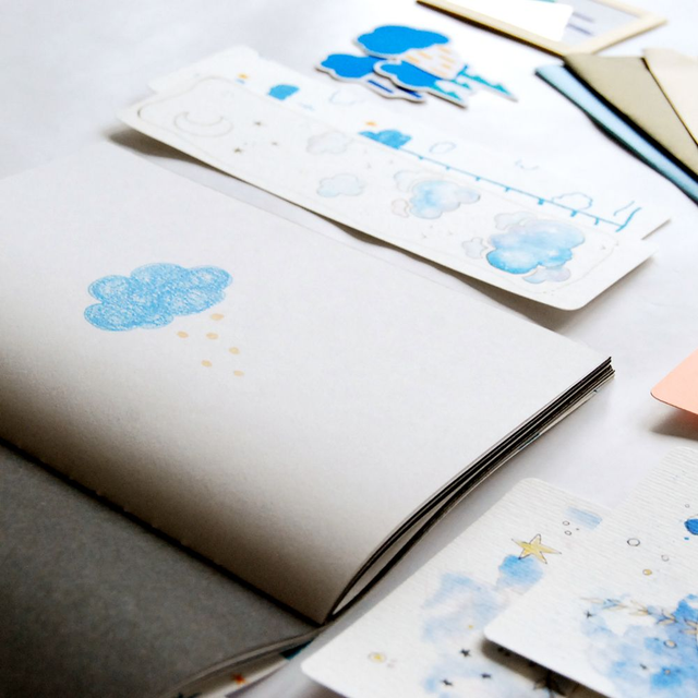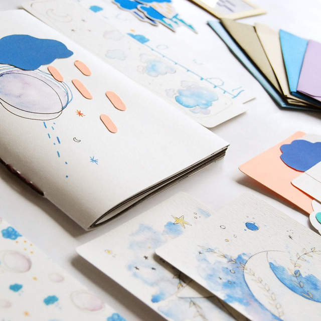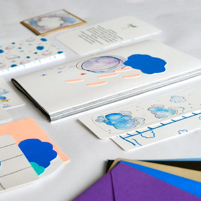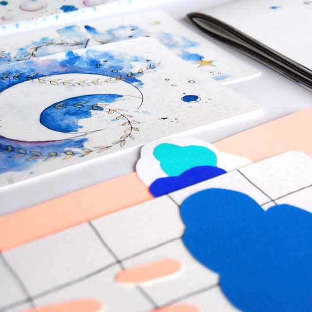 Nous avions à cœur de créer une collection de papeterie où se mêleraient nos deux univers, remplie de couleurs et de douceurs sur le thème de l’univers.